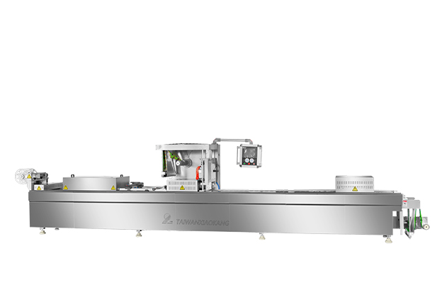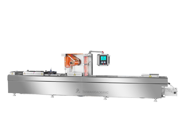氣調(diào)盒式真空包裝機工作原理: 先將產(chǎn)品放在托盤里,再將托盤放入設備的放料區(qū),托盤隨著鏈條的向前運行進入到封口模具里 ,模具上升,在封口模具里將上膜附在托盤上,先抽真空(可根據(jù)用戶產(chǎn)品包裝要求,在抽象真空 的基礎上,充氮氣或混合氣體進行包裝)封口、(上膜和托盤封在一起)沖切,最后排氣,降膜, 包裝好的產(chǎn)品隨著鏈條繼續(xù)向前運行,從出料口出料。設備還附加了光電跟蹤對齊彩膜系統(tǒng),為用 ...